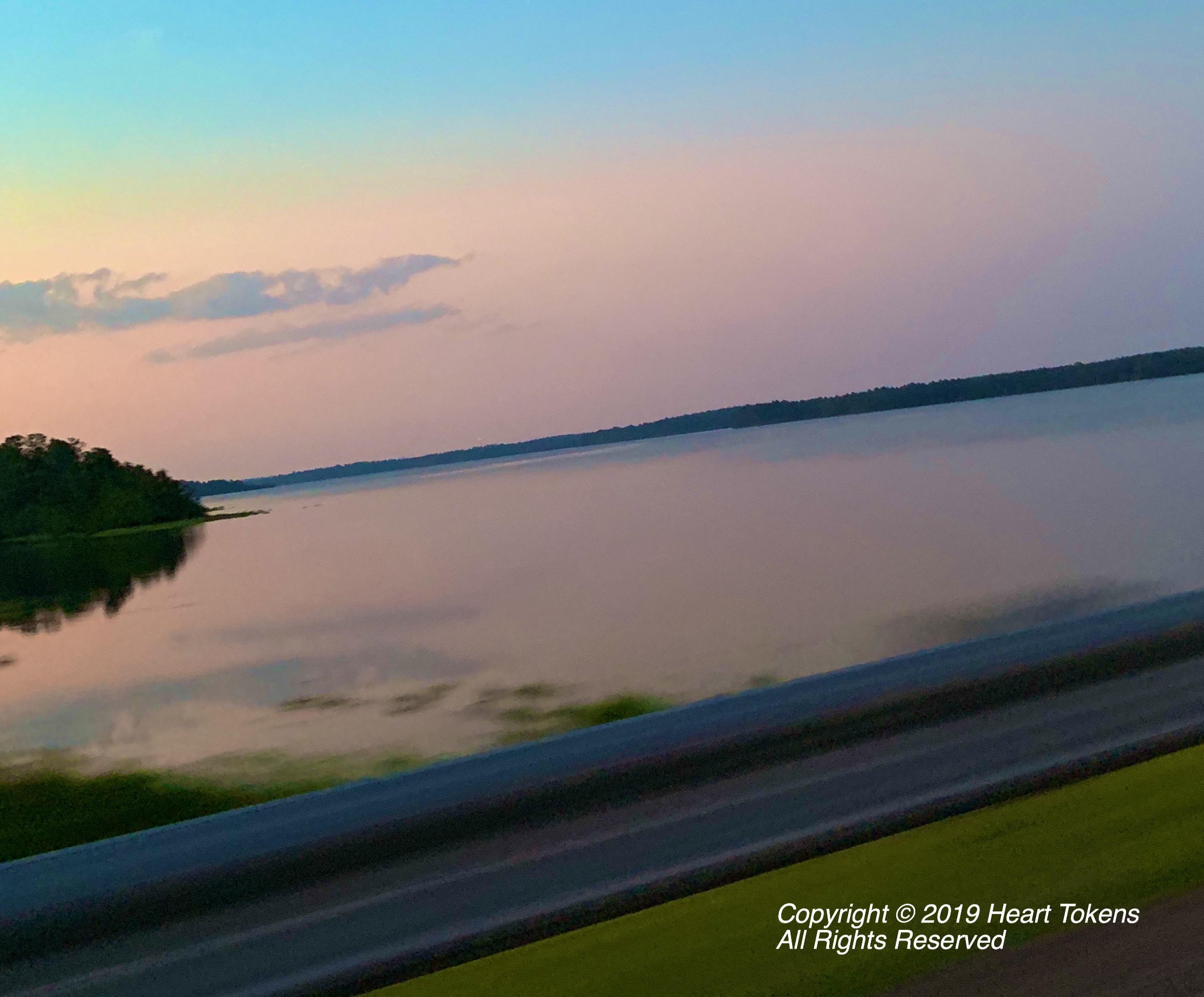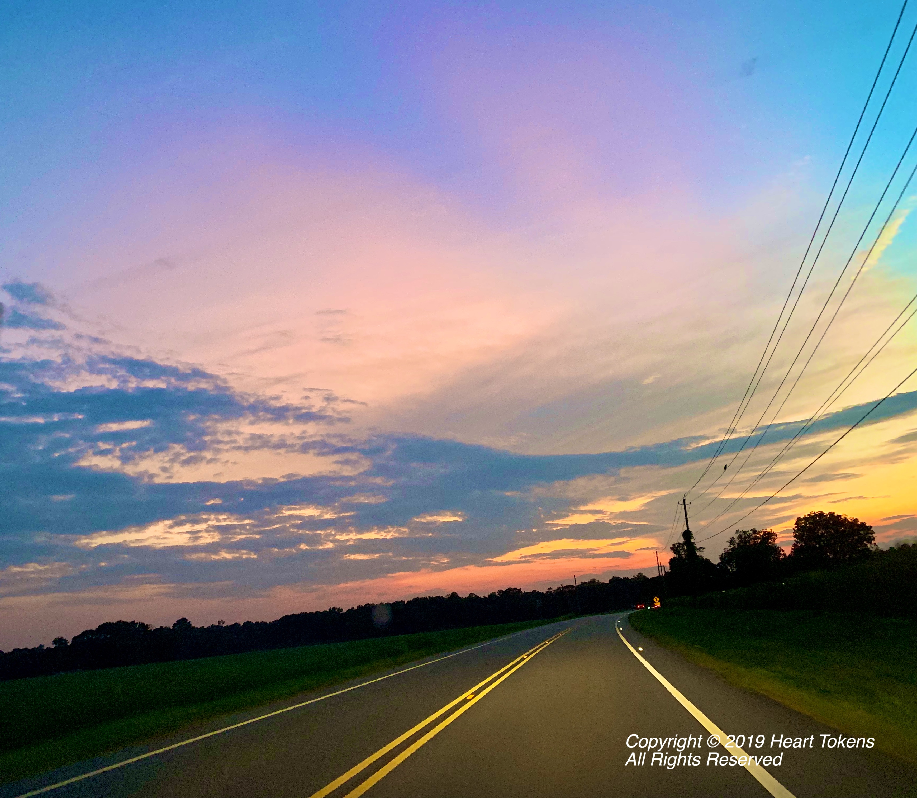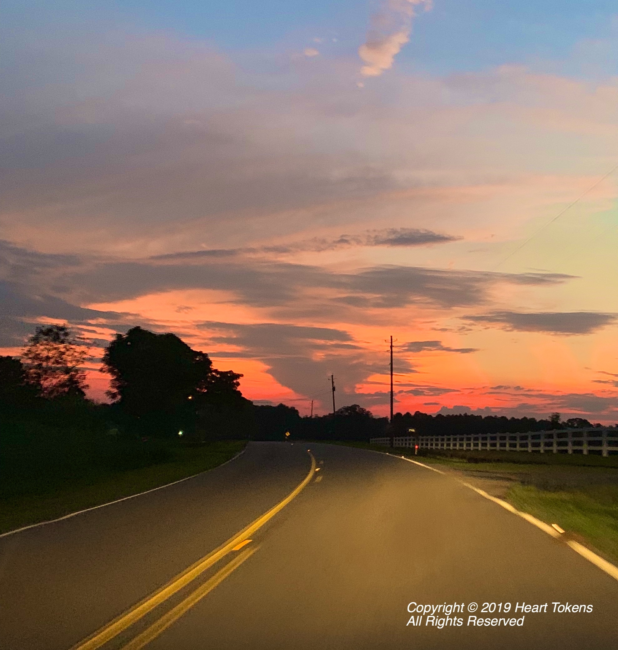 God’s painting was so breathtaking I had to smile!😍A Dragonfly Visit 💘It was a striped variety 💜The purple part almost looks like a heart, but it’s probably just me🤷🏼♀️ Can you see the hawk on the power lines up ahead? We saw it as it flew in and landed as we passed by on our way in, and it was still there on the way back! 🙀At the end of the lakeIts starting to get dark on the journey back homeThe sky looks like a sunbeam!A pic of the moon peeking through the trees in the back yard The lake looks so serene ✌️ Look what I found when I zoomed, cropped and turned the pic of the moon around! My word!🙀 💜🌷