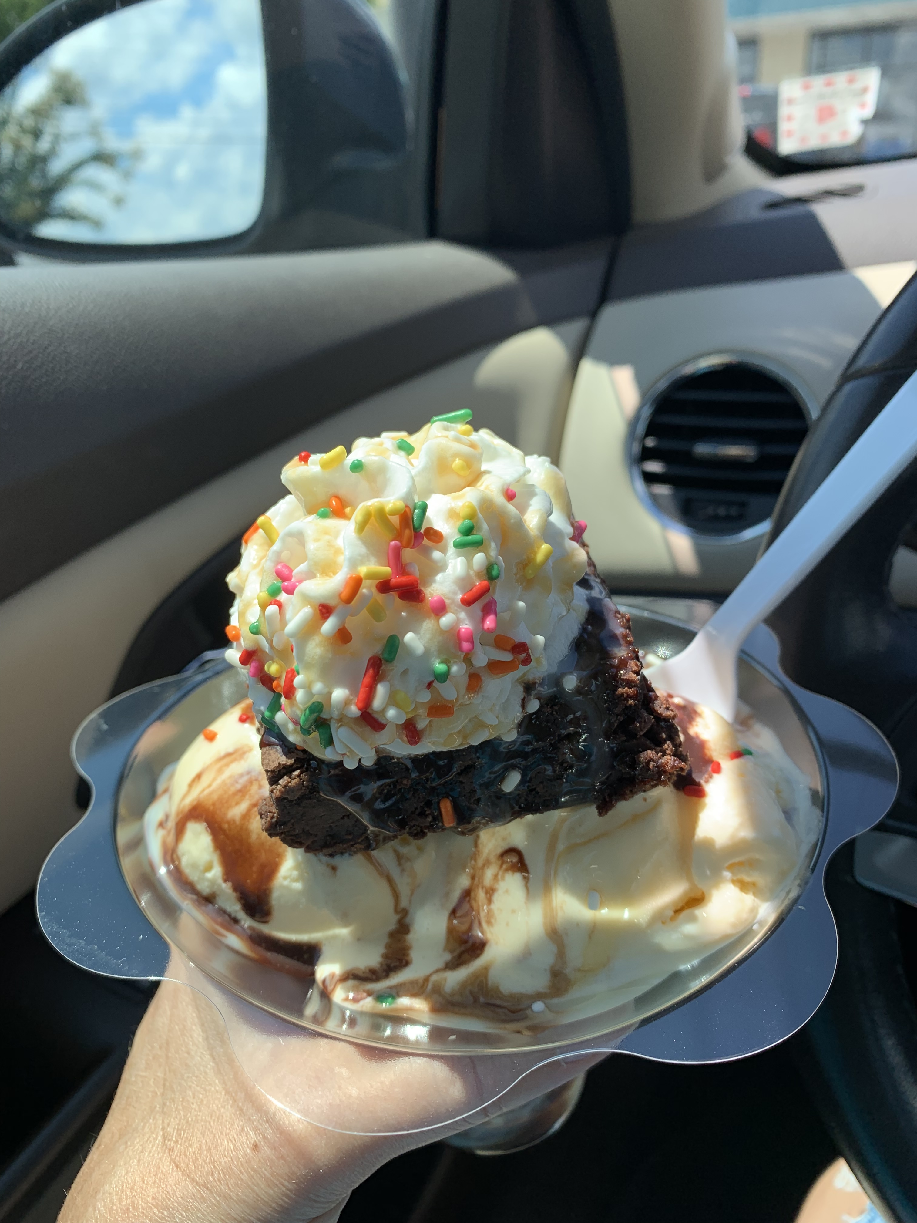 Vanilla ice cream with a brownie and chocolate syrup. I wanted the Pineapple Dream. It has pineapple sorbet, coconut ice cream, cheesecake and marshmallow cream. They were out of the marshmallow cream and pineapples. 🙁