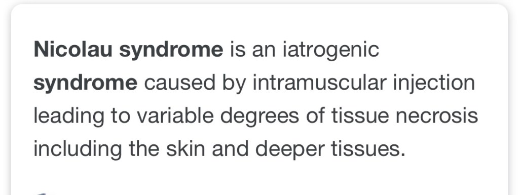 The ER receptionist bumped her ahead of everyone when told what was going on. Again, the ER doctor and the nurses had never seen anything like it. The doctor examined her. Asked lots of questions, looked over the pics of what it looked like at the beginning. Took pics. He ruled out everything that had been previously thought and said there was no necrosis present, so could not be Nicolau Syndrome.